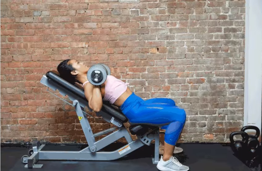 - Aim to complete sets of 8 to 12 reps. Start with one set and work up to two to three sets over time as you build strength. When you finish your set, safely exit the exercise by sitting up and placing the dumbbells on your knees before you stand up. Avoid dropping the dumbbells while you’re lying on the incline bench.