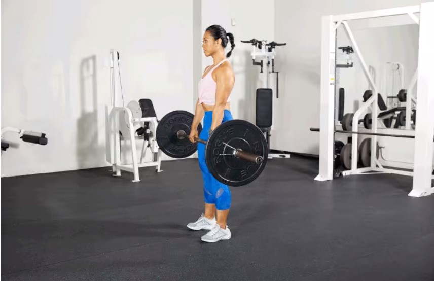 - The bar should almost graze the shins and rest around the thighs as you reach full height. Pull the shoulders back as much as possible without bending backward.